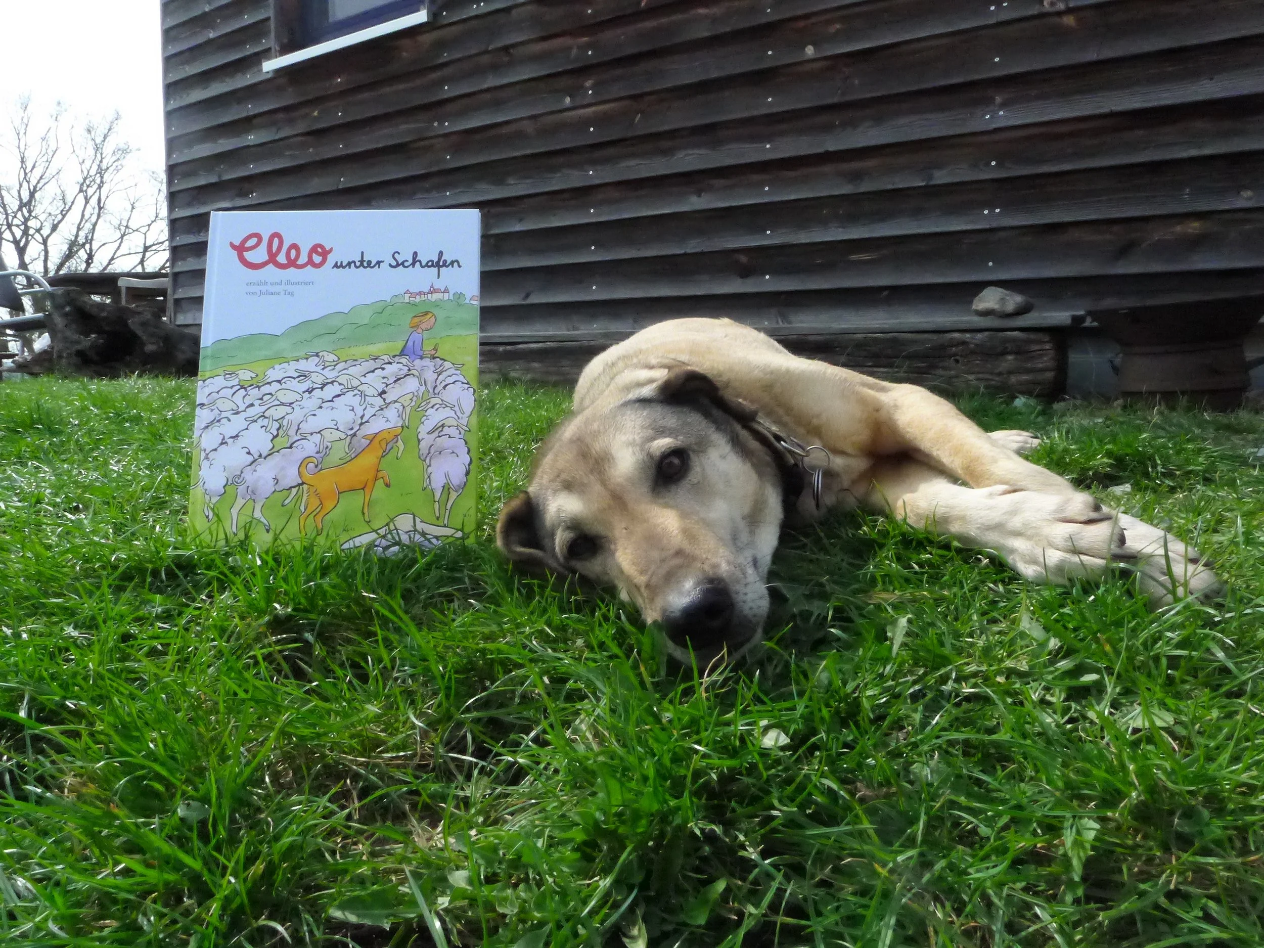 Cleo - noch etwas frühjahrsmüde - mit ihrem neuen Buch »Cleo unter Schafen«, April 2018.